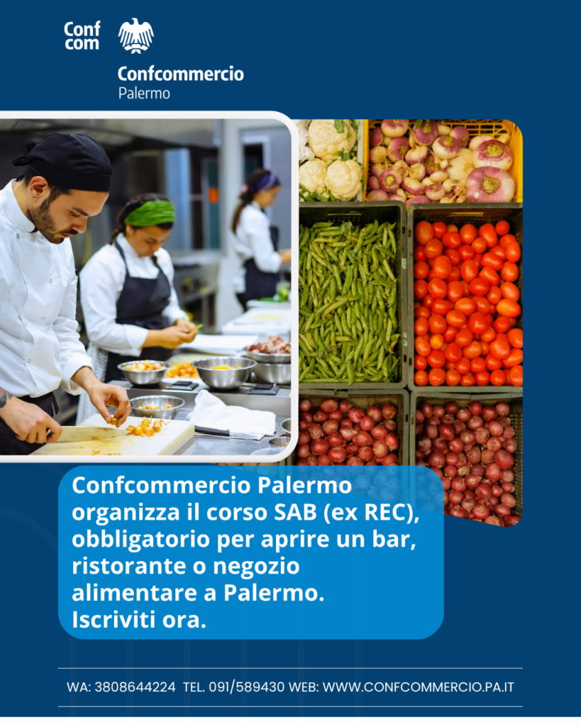 Se vuoi aprire un bar, un ristorante, una pizzeria, un negozio di alimentari, una gastronomia o qualsiasi attività che preveda la vendita o somministrazione di alimenti e bevande a Palermo, hai bisogno dell’abilitazione SAB (ex REC). Confcommercio Palermo organizza il corso abilitante riconosciuto dalla Regione Sicilia.